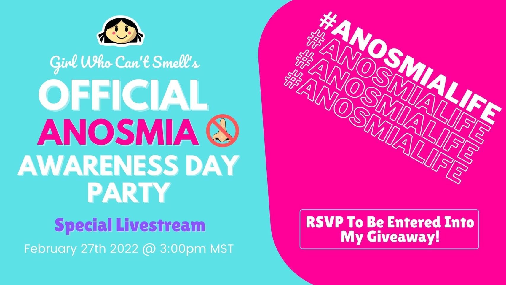 “ARE YOU READY TO Celebrate Anosmia Awareness Day? Our super unique, one-of-a-kind special day is coming up soon! Let’s chat, hangout, share our stories and have fun! Pop in any time during the livestream but secure your space! RSVP’ing to this event enters you into my live giveaway!”