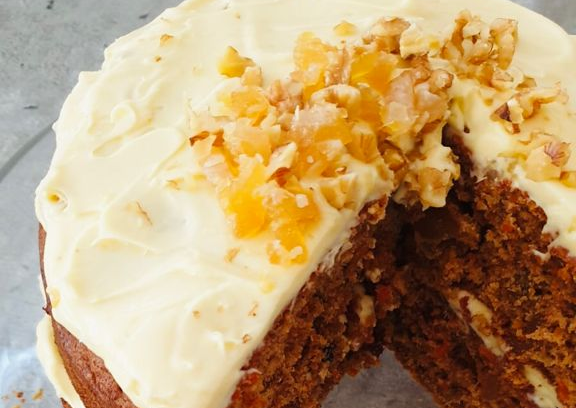 Carrot cake that’s fragrantly spiced with cinnamon and nutmeg and topped with a mascarpone cheese frosting. The dates and ginger add incredible flavor!Â